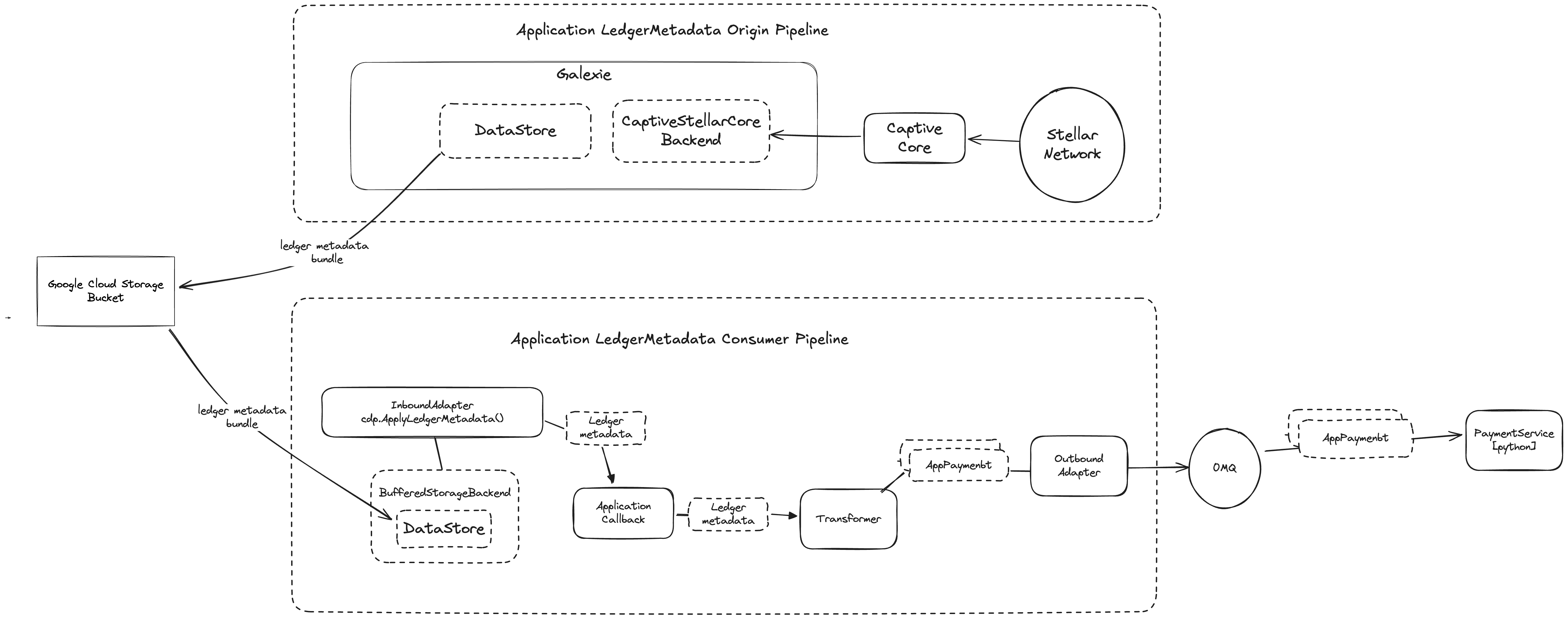 Refer to Ingestion Pipeline Sample Application for complete consumer code example, demonstrating a live, streaming pipeline against the Stellar network, processing each new ledger's metadata as it is closed on the network.