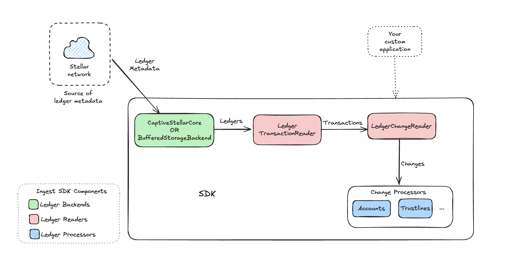 1. Ledger Backends: Used to stream ledgers from the Stellar network. https://github.com/stellar/go-stellar-sdk/tree/main/ingest/ledgerbackend